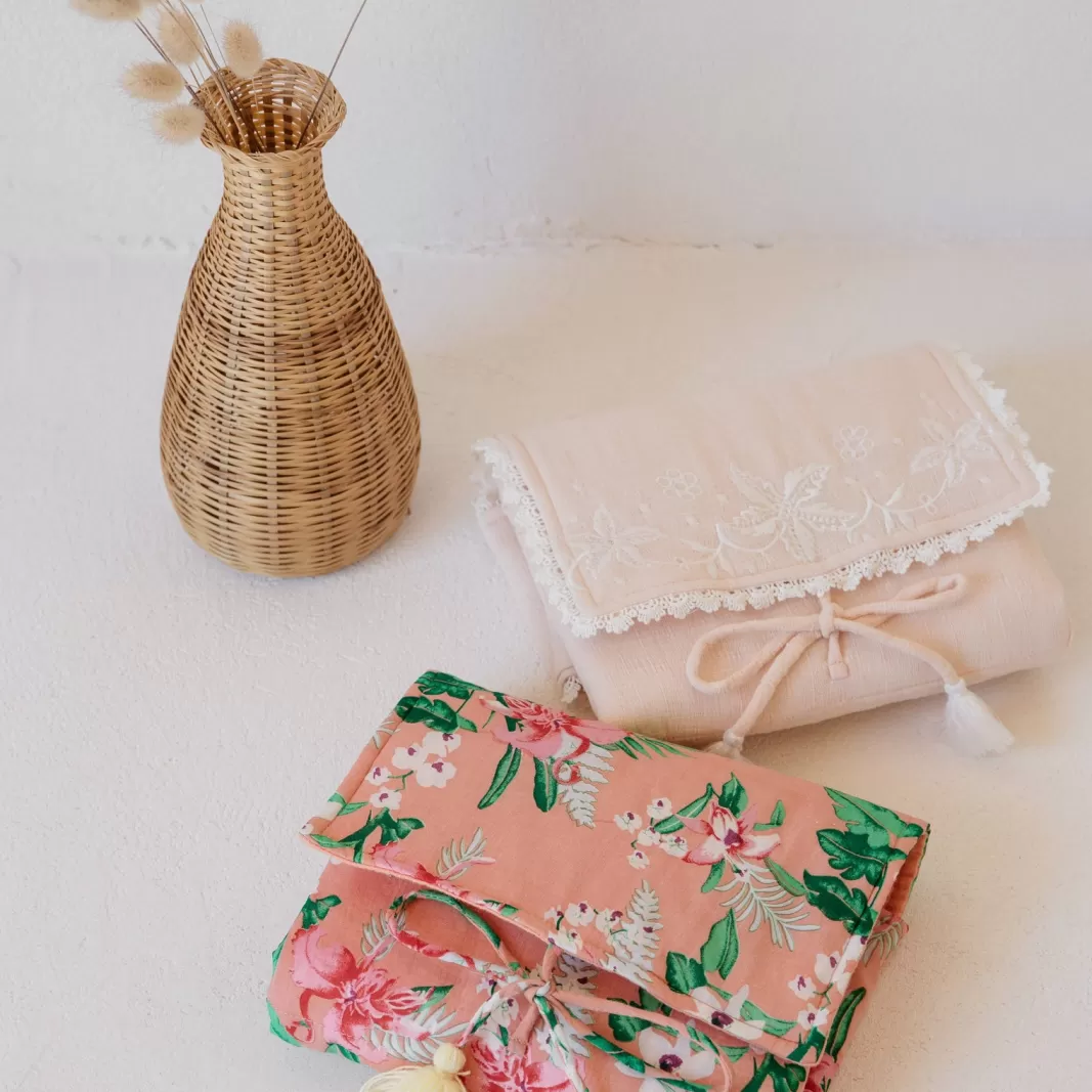 – Fermeture par un lien prolongé de délicats pompons blancs