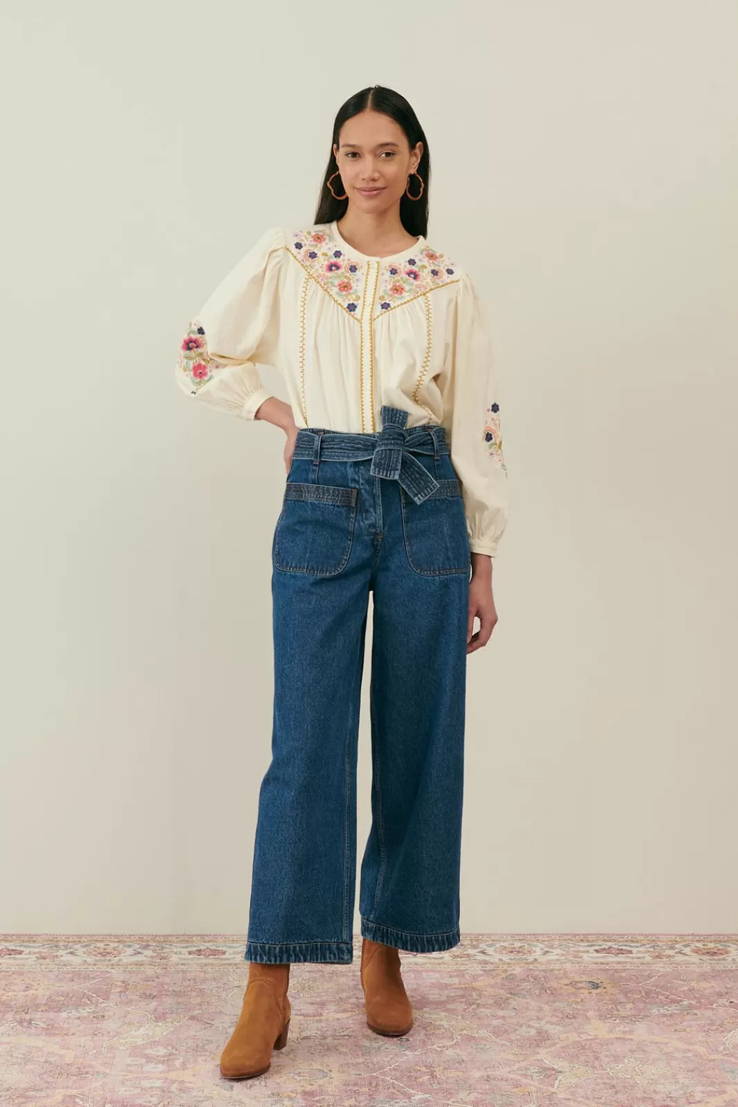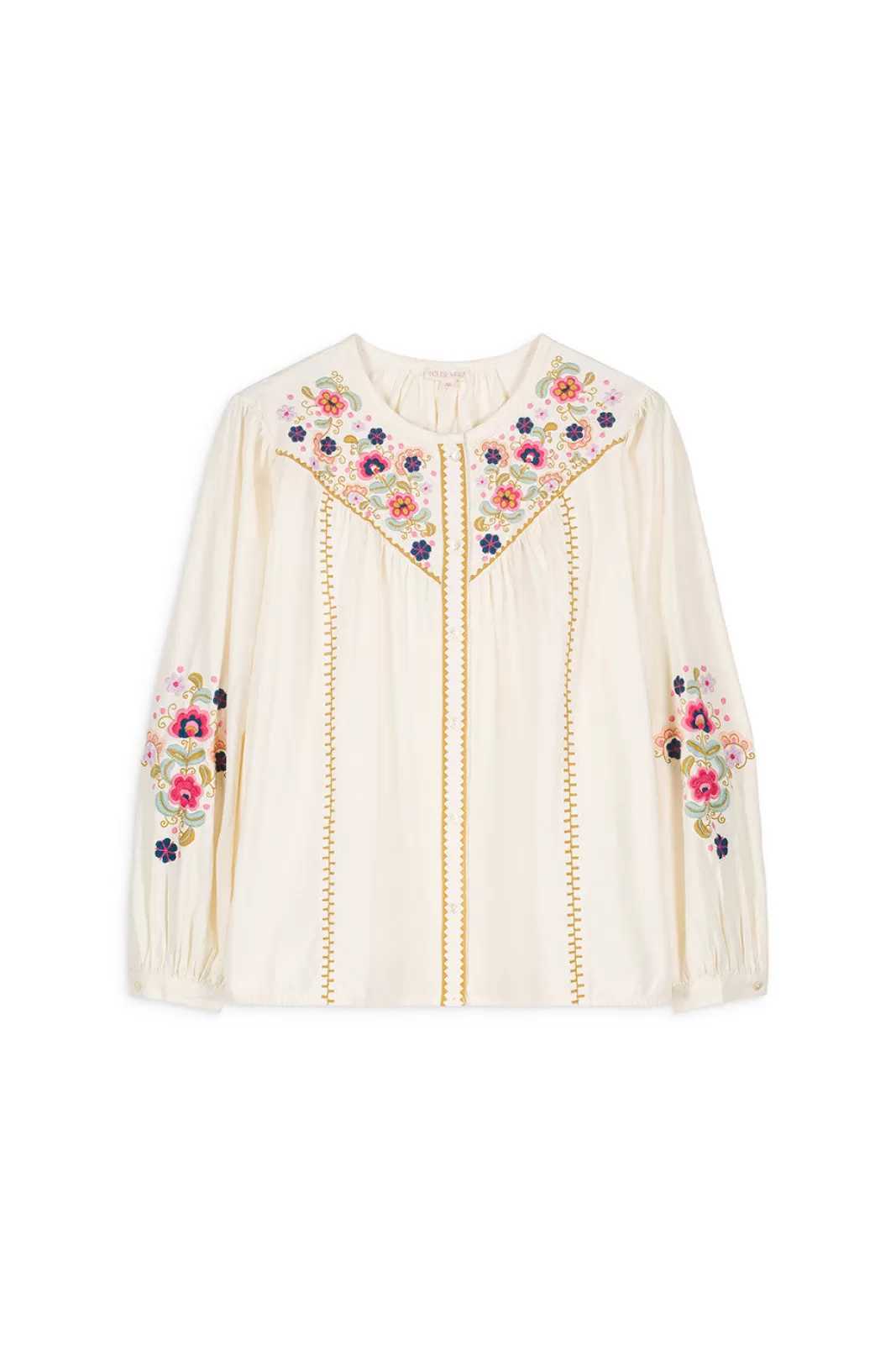 - Broderies fleuries contrastées sur les manches.