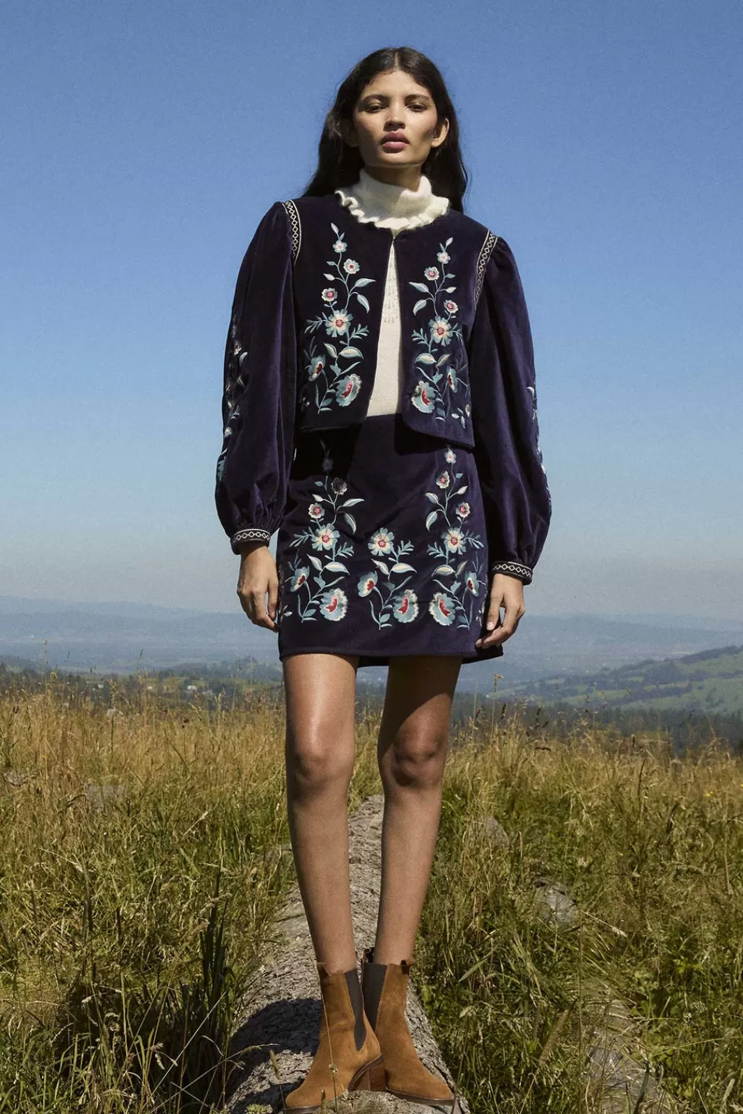 Composée comme un poème, cette jupe taille haute fait rimer broderies et velours avec délicatesse. A porter de jour comme de nuit avec la veste Duras pour un total look plus poétique que jamais.