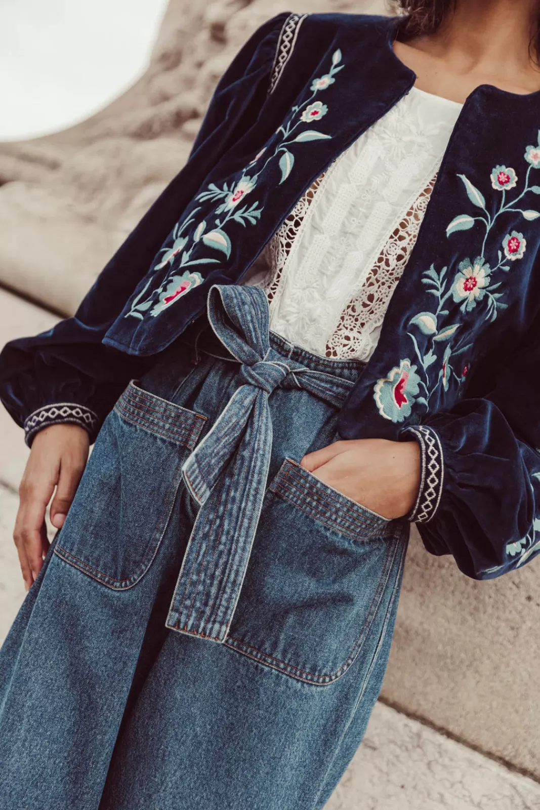 - Broderies graphiques à l’emmanchure et en bas de manche.