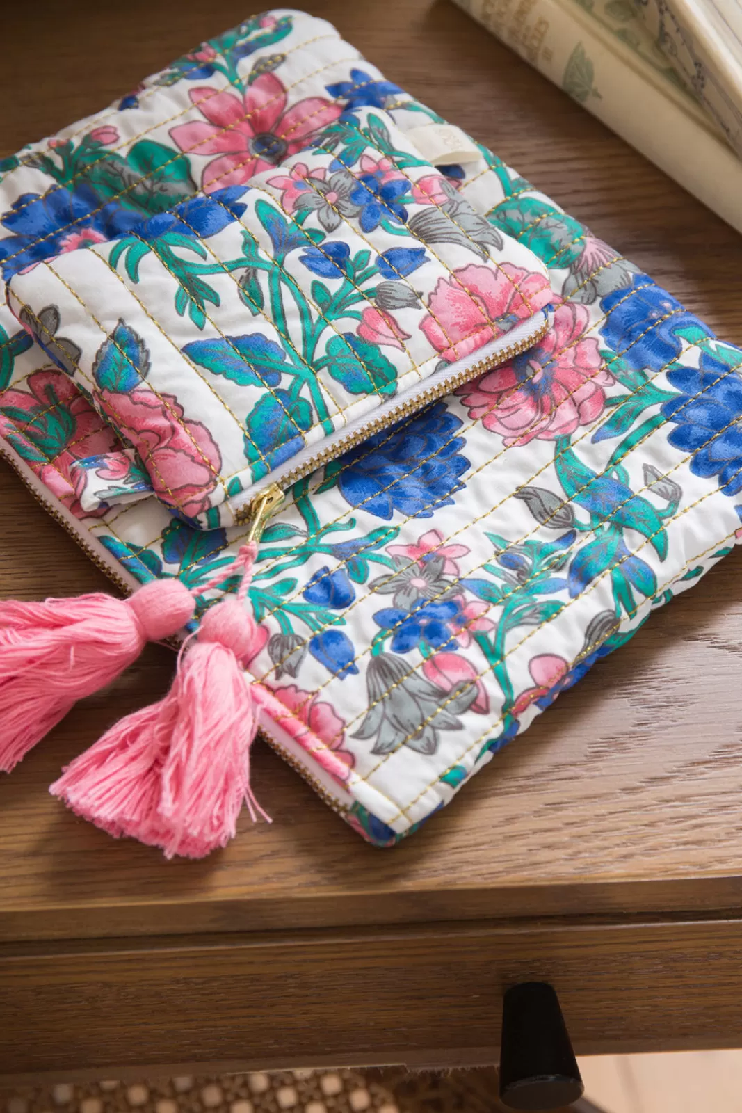 Accessoire pratique et bohème, cette pochette matelassée et pomponnée est indispensable au quotidien. On y glisse ses petites affaires, on s’en sert comme d’un grand portefeuille, bref elle ne nous quitte jamais. À offrir ou à s’offrir !