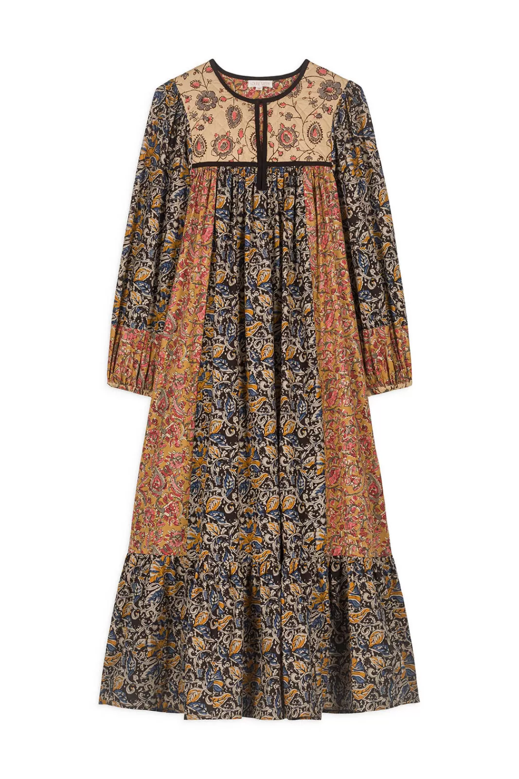 Cette robe est un modèle bohème par excellence qui mélange les styles et les époques. Sa forme d’inspiration folklorique mêle plusieurs imprimés traditionnels indiens ! Le tout en 100% coton, à porter dès la mi-saison.