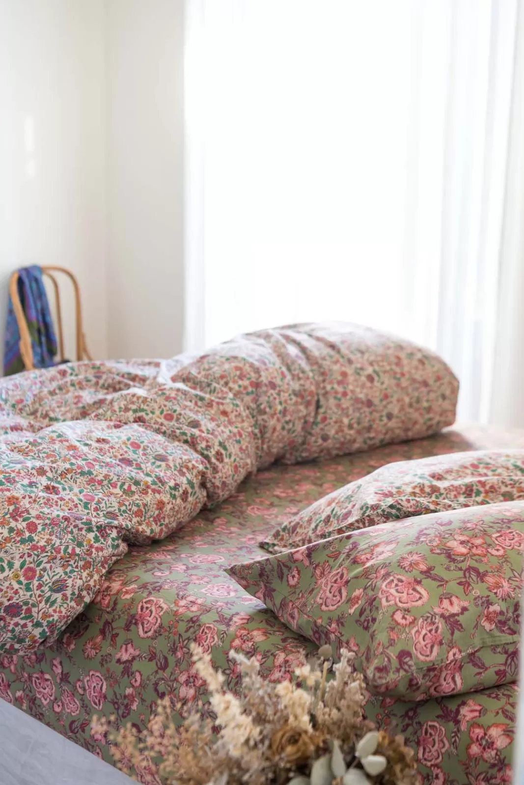 Cette saison, le linge de lit se pare avec douceur des imprimés indiens de la collection. Draps housse, taies d’oreille…