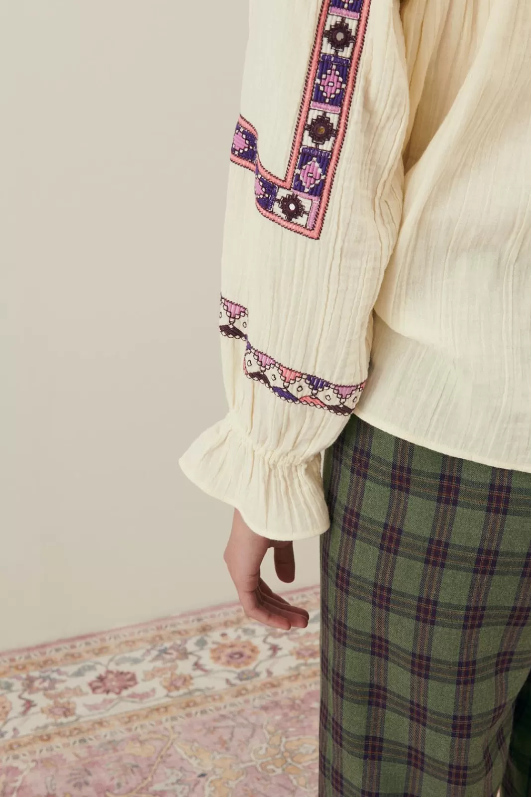 Résolument bohème, on aime cette blouse pour son tombé fluide et son plastron brodé.On se laisse surprendre par ces incrustations de petits miroirs qui nous prouvent que chaque pièce est imaginée à la façon d’une oeuvre d’art.